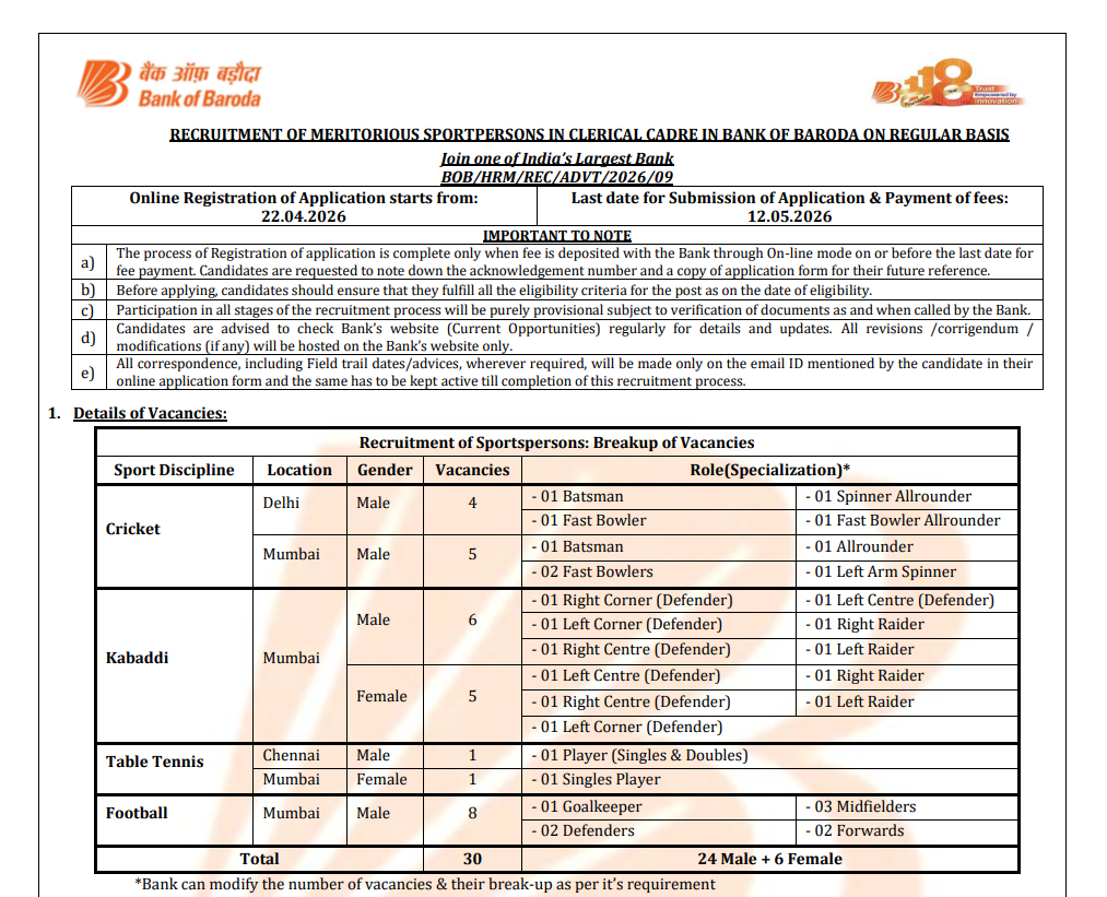 About Post: Bank of Baroda (BOB) has released official notification for BOB Bank Clerical Cadre (Sports Quota) Customer Services Associate Recruitment 2026 for 30 posts. Candidates who want to make career in Banking sector and have Sports qualification can apply for BOB Customer Service Associate Vacancy 2026. Online application starts from 22 April 2026 to 12 May 2026. Candidates are advised to read full notification before apply online application for BOB Bank Clerk (Sports Quota) Recruitment 2026.