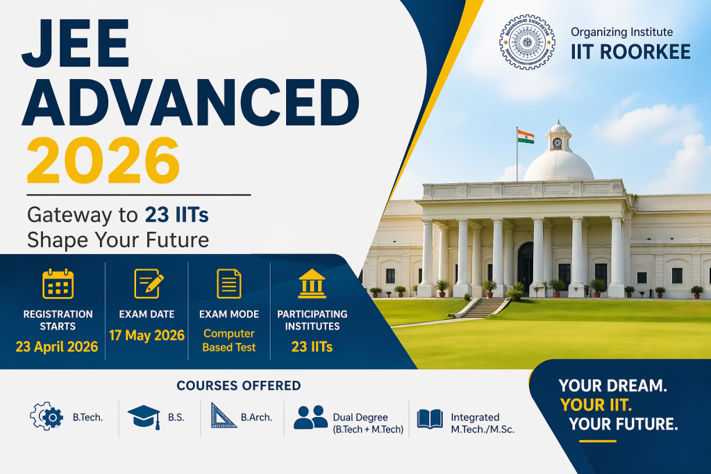 About Post- IIT JEE Advanced 2026 is a national-level entrance exam organized by Indian Institute of Technology Roorkee for admission to undergraduate programs across 23 IITs. Eligible candidates who qualify JEE Main 2026 and rank among the top 2,50,000 can apply online from 23 April 2026. The exam will be held on 17 May 2026 in two papers and offers courses like B.Tech., B.S., B.Arch., Dual Degree, and Integrated M.Tech./M.Sc.